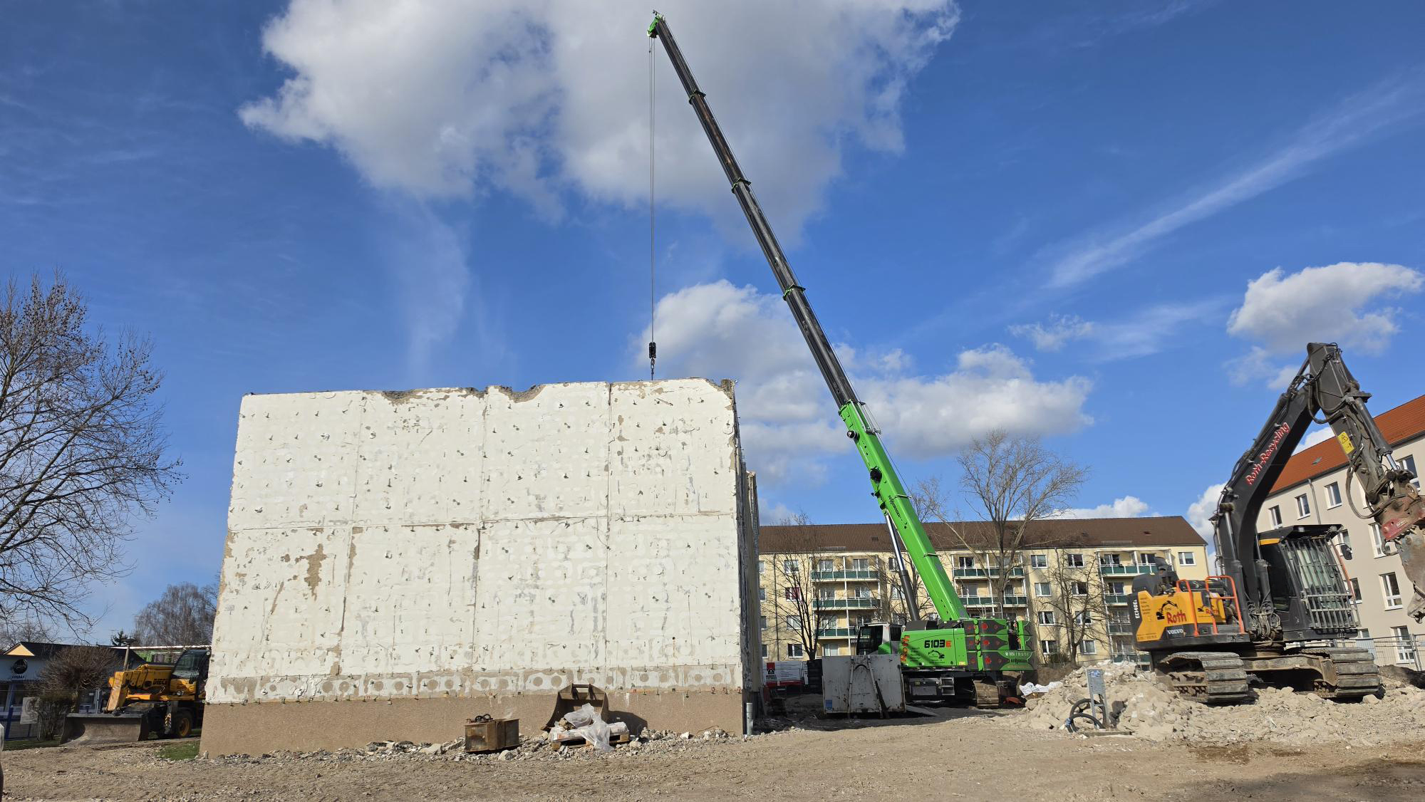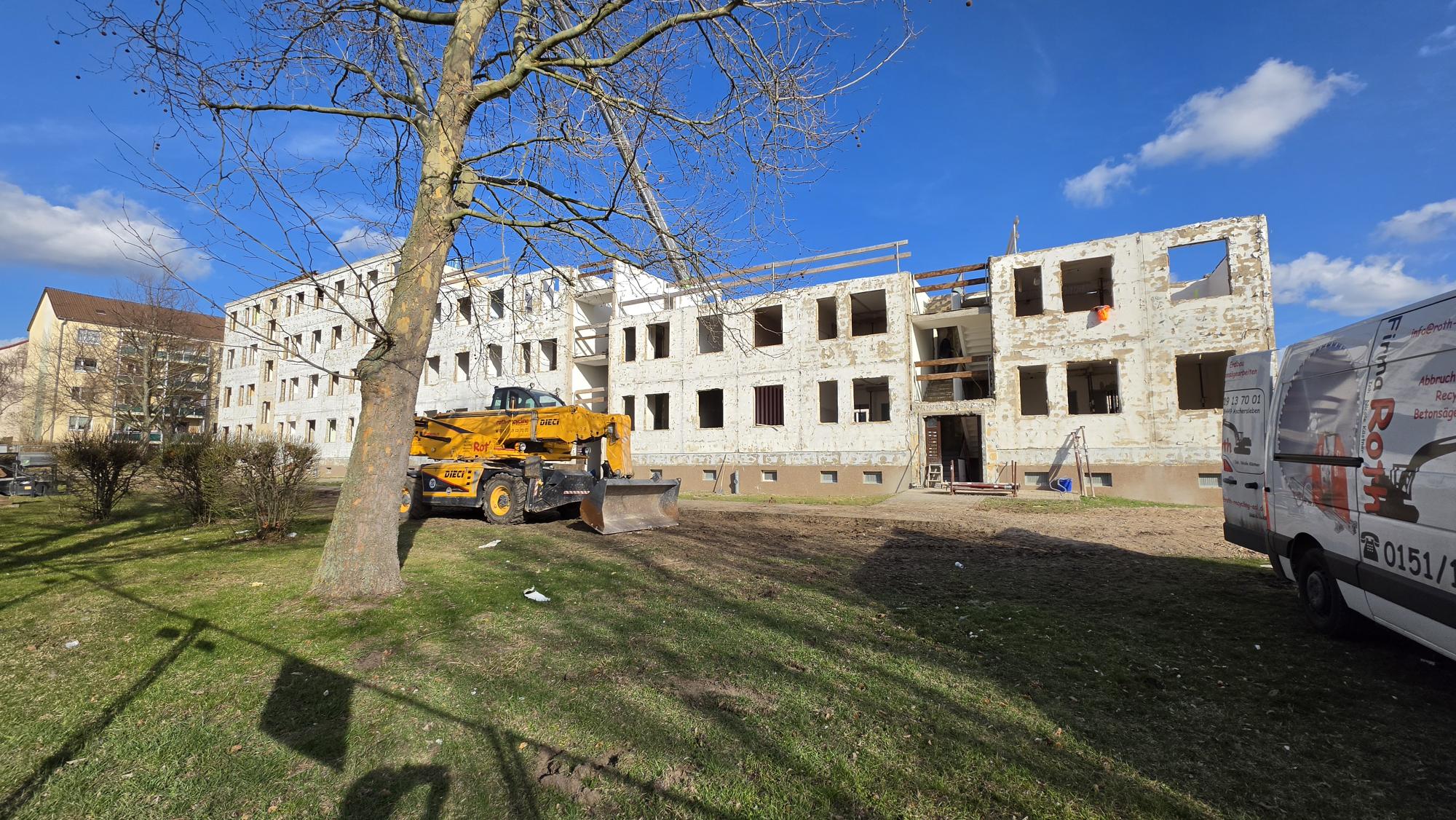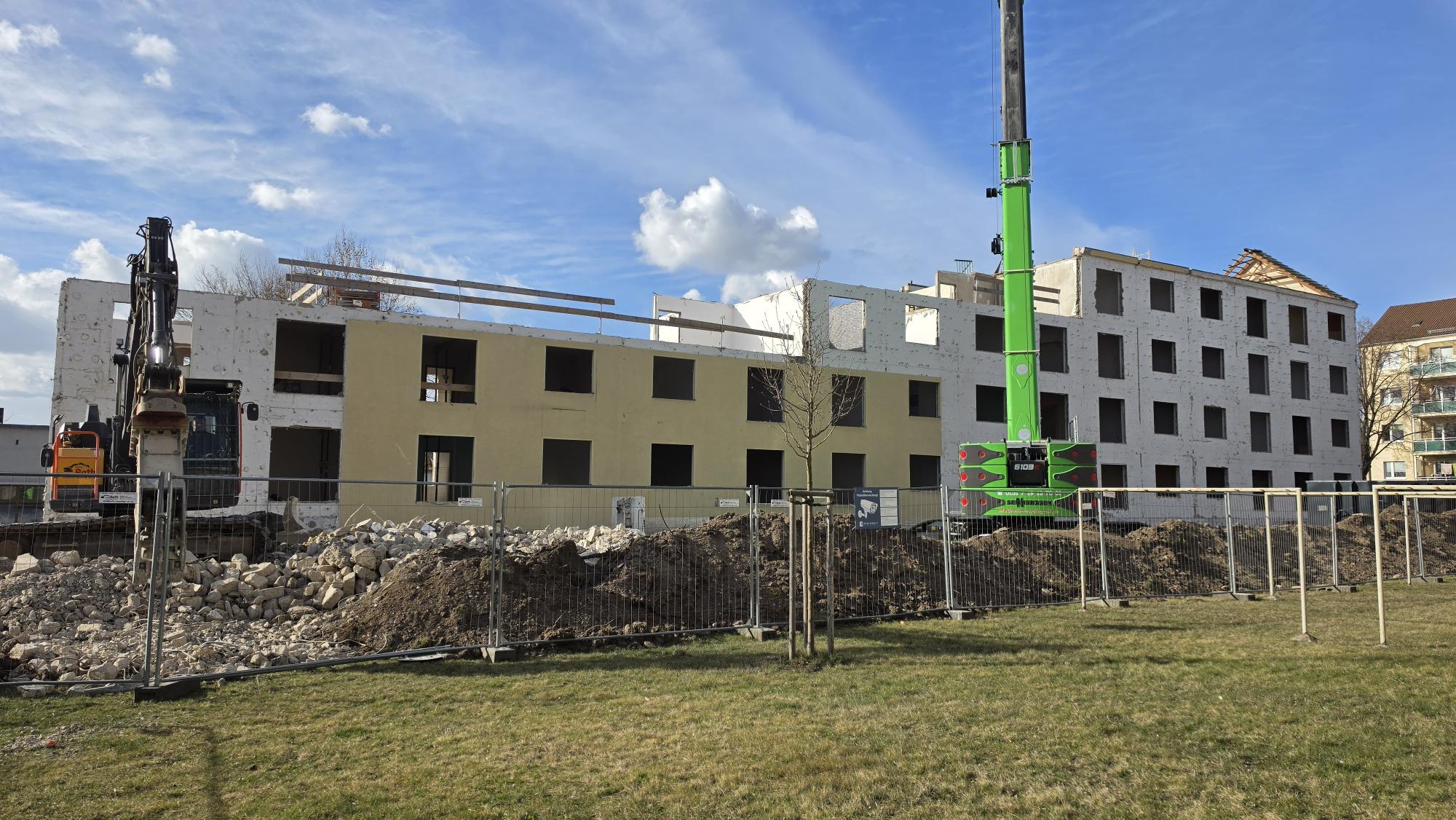 Auf der Vorder- und Rückseite des Hauses sind schwere Baumaschinen im Einsatz. Ein großer Kran steht zentral auf dem Gelände und unterstützt beim Entfernen weiterer Bauteile. Die Bagger arbeiten an den noch bestehenden Wandteilen und sorgen für den kontinuierlichen Rückbau. Auf dem Gelände liegen bereits umfangreiche Abbruchmaterialien, die zeigen, wie viel bereits geschafft wurde.