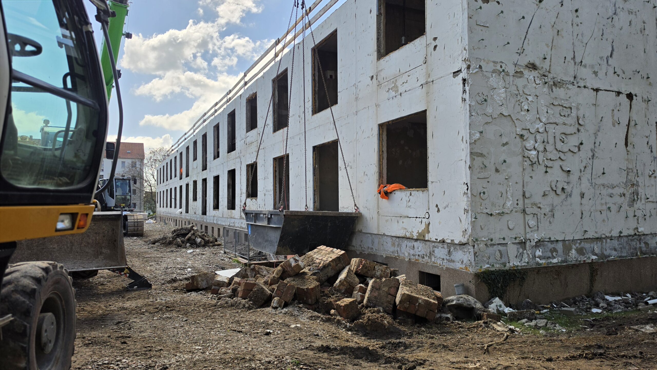 Mehrere Großgeräte sind parallel im Einsatz. Ein Kran unterstützt weiterhin die Arbeiten in den oberen Bereichen des Gebäudes, während Bagger den kontrollierten Rückbau einzelner Bauteile übernehmen und das anfallende Material abtransportieren. Auf dem Gelände sind deutliche Veränderungen an den Bodenflächen zu sehen, die auf vorbereitende Arbeiten für die kommenden Bauabschnitte hindeuten.